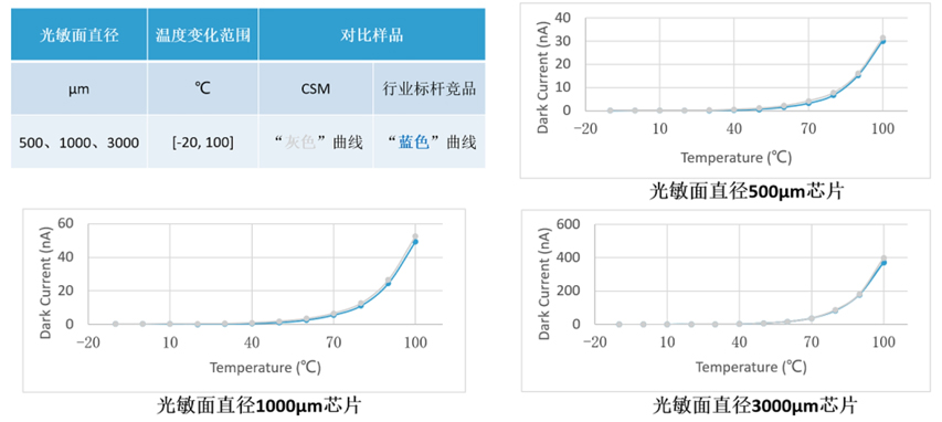 与此同时,米兰官网还兼顾了大尺寸MPD芯片的性能表现,实现真正意义上的降本增效,做出了比肩业内标杆企业的产品。图2为室温下测得的芯片级MPD产品的暗电流、结电容及响应度数据。即便对于直径3000μm的芯片,暗电流的均值也在3nA级别,相同测试条件下满足甚至低于市面常见规格。暗电流随温度变化的稳定性,是表征芯片工作特性的重要指标。芯片在封装结束后,在变温条件下测试后,米兰官网MPD芯片展现出与行业标杆企业同等水平的温度稳定性。图3是[-20,100]℃下测得MPD芯片温度稳定曲线,对于500μm的芯片,在100℃时,暗电流只比-20℃下高约30nA。