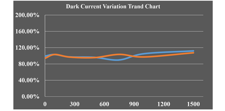 大尺寸MPD芯片经过了“高温老化”和“高温高湿双85”的可靠性验证。高温可靠性的检测时间,超过1500小时,暗电流变化幅度控制在5%以内,时长远超业内常规的[24,72]小时。“双85”老化实验条件下,封测超过500小时,暗电流稳定维持在标准以下。
